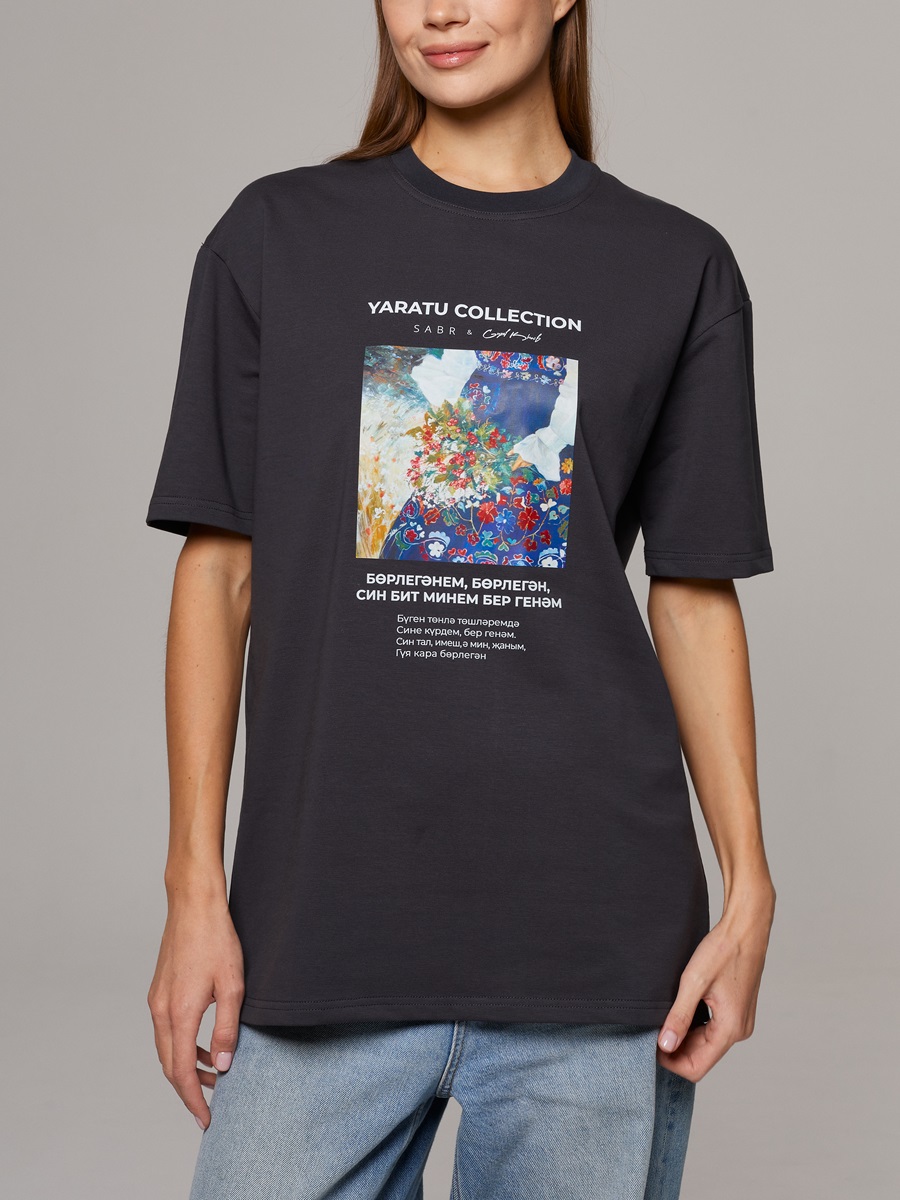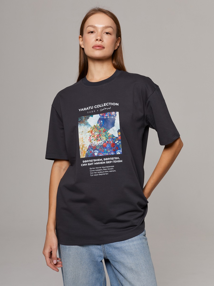 Женская футболка свободного кроя немного со спущенными плечами. Футболка выполнена из плотного, добротного трикотажа состоящий из хлопка на 95% футер 2х ниткa. Базовая футболка из коллекции Ярату в коллаборации SABR х Guzel Khaib, вдохновленная национальными ценностями. Перевод: "Этой ночью во сне Видела тебя, единственный мой. Ты был ивой, я же, милый, – Ежевикой."