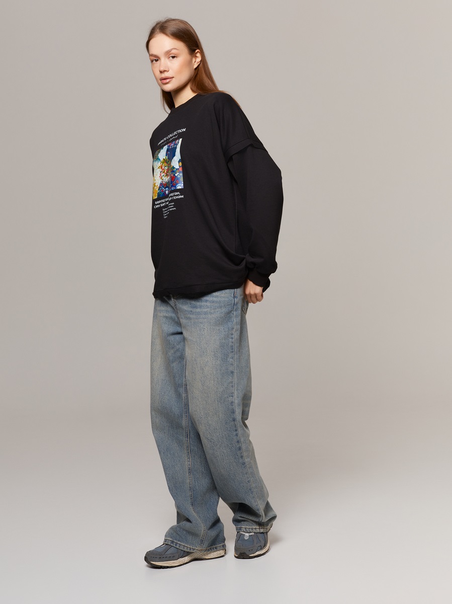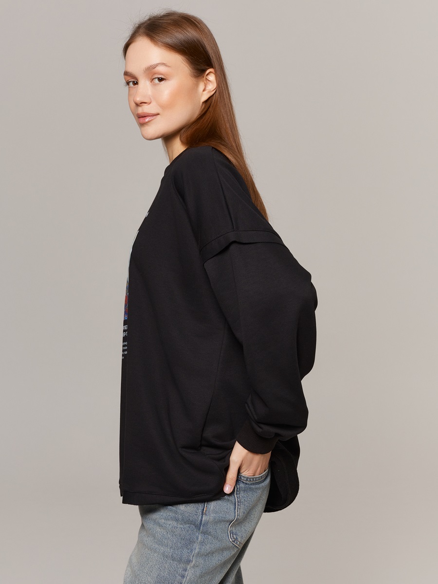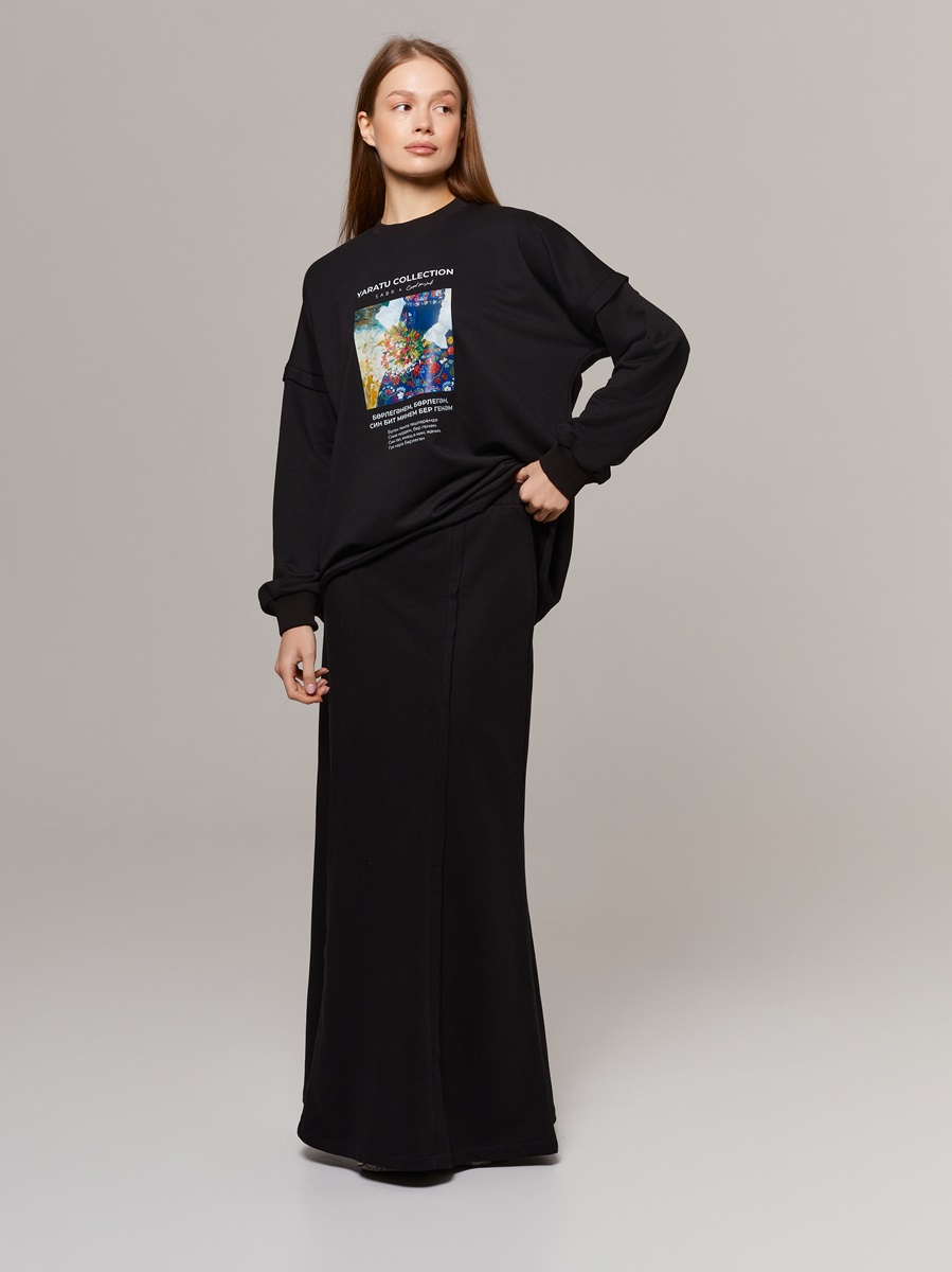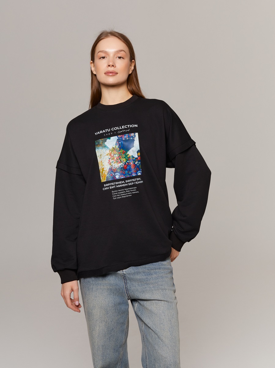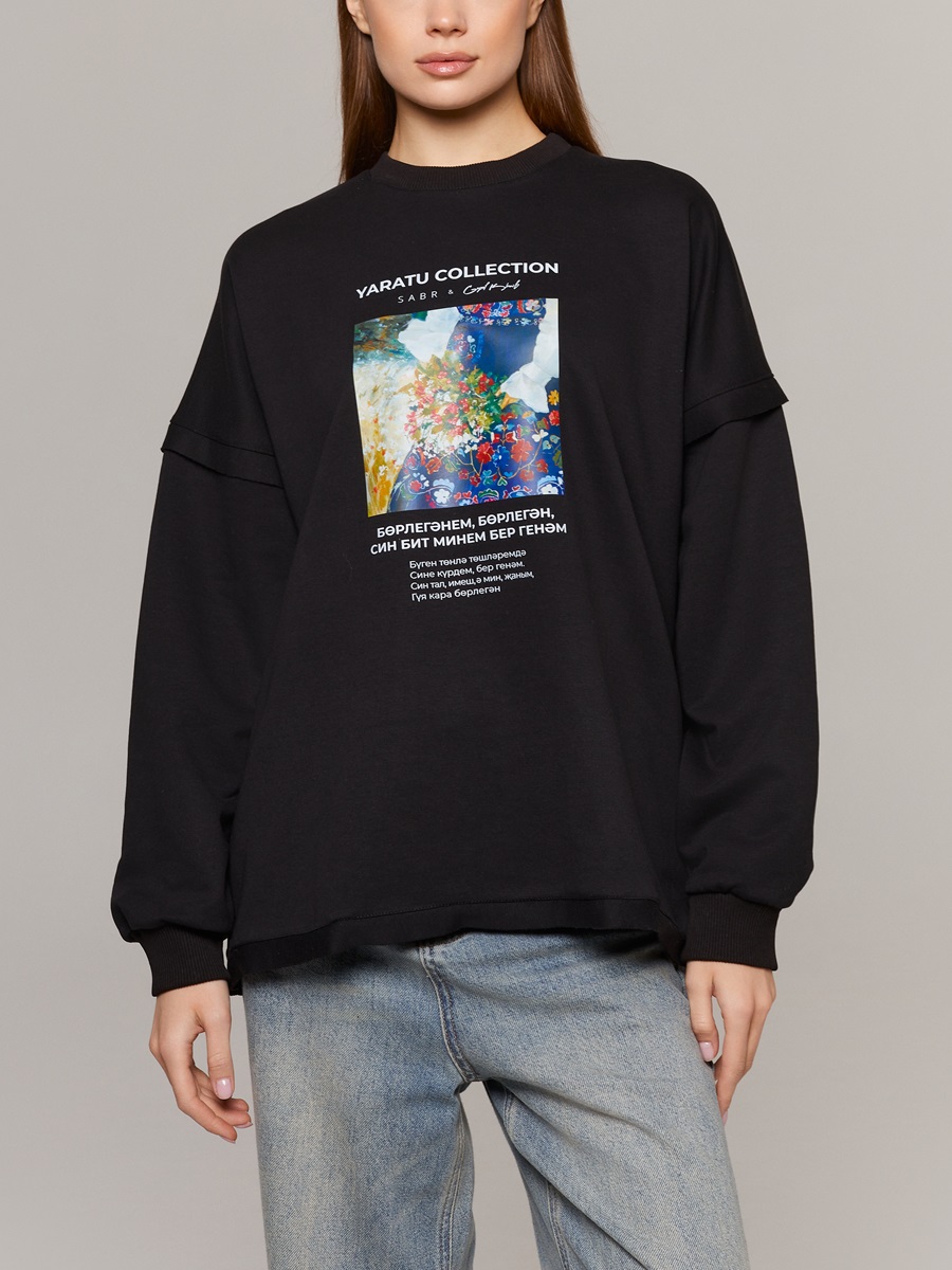 Свитшот свободного кроя со спущенными плечами, выполнен из трикотажа состоящий из хлопка на 85%. Края свитшота не обработаны, на износостойкость не влияет. Оверсайз толстовка коллекции Ярату - это коллаборация бренда SABR и тюркской художницы Guzel Khaib - вдохновленная национальными тюркскими ценностями. Все принты из данной коллекции копии настоящих картин, нарисованных Гузель Кхайб. Примерный перевод: "Этой ночью во сне Видела тебя, единственный мой. Ты был ивой, я же, милый, – Ежевикой."