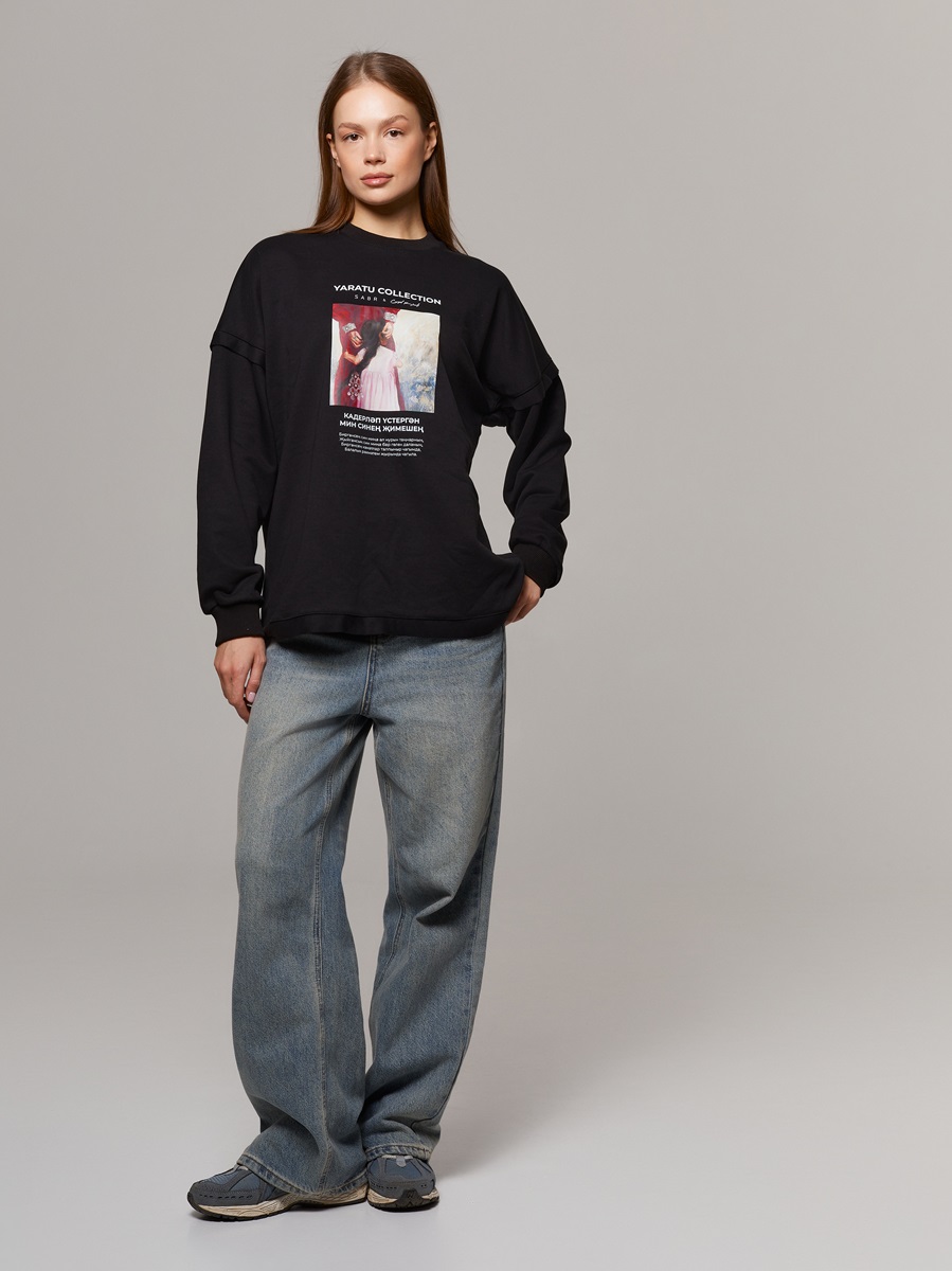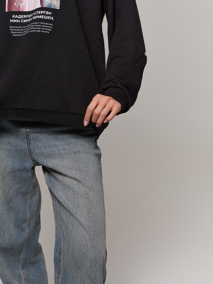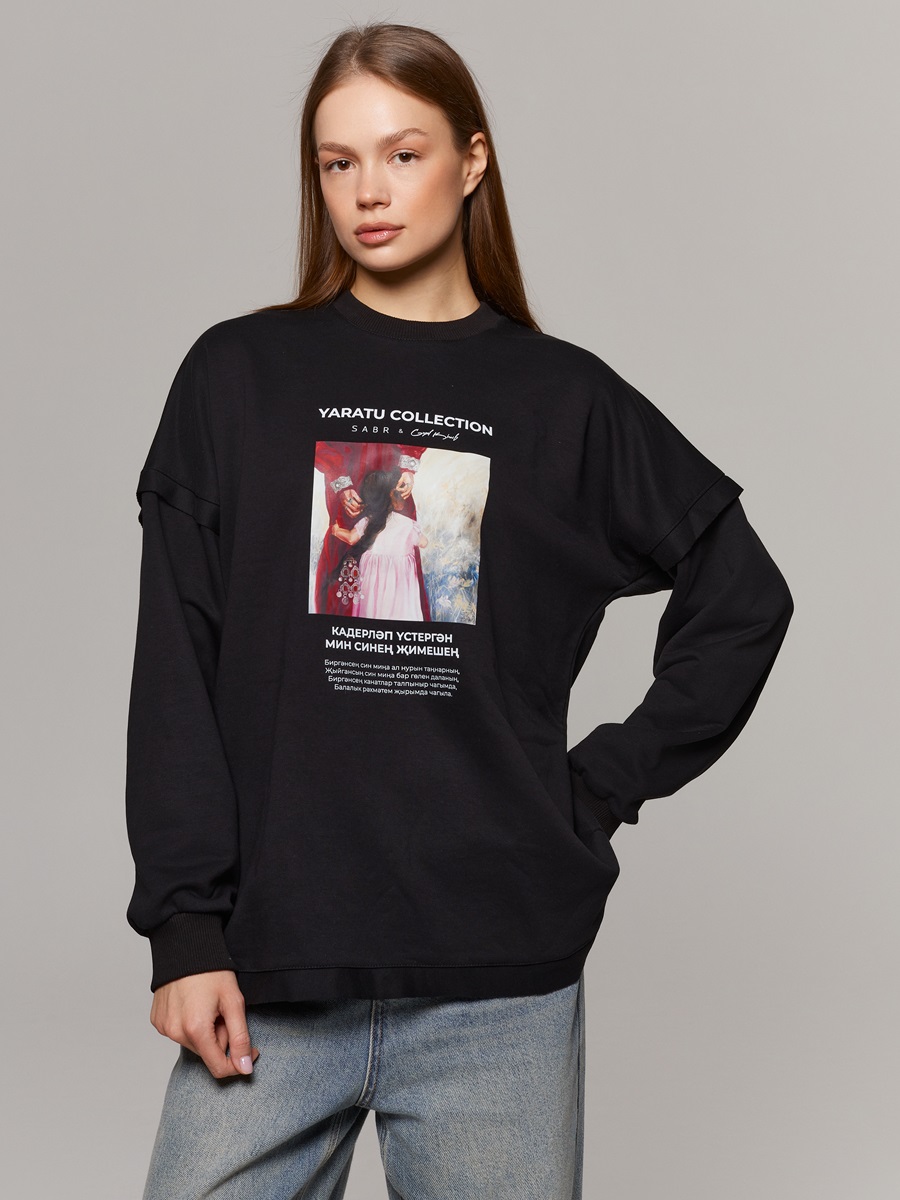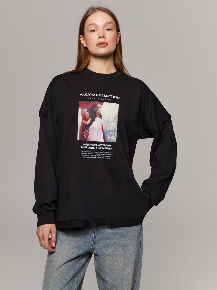 Свитшот свободного кроя со спущенными плечами, выполнен из трикотажа состоящий из хлопка на 85%. Края свитшота не обработаны, на износостойкость не влияет. Оверсайз толстовка коллекции Ярату - это коллаборация бренда SABR и тюркской художницы Guzel Khaib - вдохновленная национальными тюркскими ценностями. Все принты из данной коллекции копии настоящих картин, нарисованных Гузель Кхайб. Примерный перевод: "Я - та ягодка, которую ты бережно растила Дарила ты мне розовые лучи рассветов, Собрала для меня все цветы полей Давала крылья когда я оступался Детская благодарность отражена в моей песне".