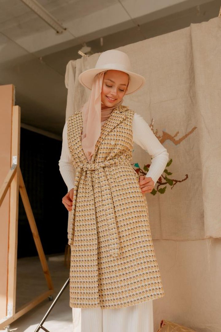 Элегантный жилет из твидовой ткани крупной вязки на подкладе. Модель имеет удлиненный силуэт, V-образный вырез, пояс на талии, два боковых кармана. Прекрасно сочетается с базовыми платьями.